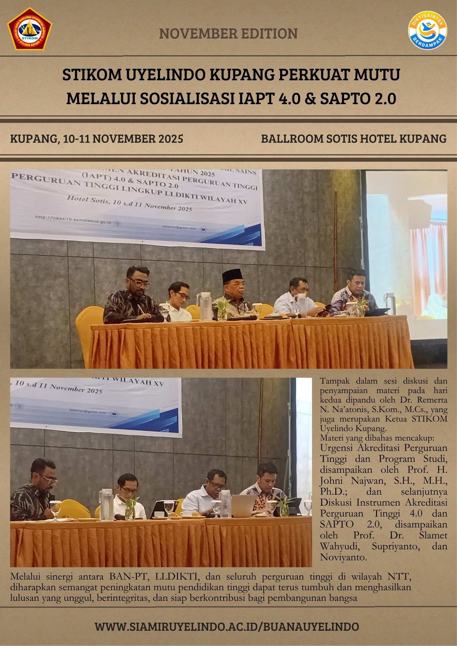 Buanauyelindo โ Sekolah Tinggi Manajemen Informatika Komputer (STIKOM) Uyelindo Kupang berpartisipasi dalam kegiatan Sosialisasi Peraturan Menteri Pendidikan Tinggi, Sains, dan Teknologi Nomor 39 Tahun 2025 serta Instrumen Akreditasi Perguruan Tinggi (IAPT) 4.0 & SAPTO 2.0 yang diselenggarakan oleh Badan Akreditasi Nasional Perguruan Tinggi (BAN-PT) bekerja sama dengan Lembaga Layanan Pendidikan Tinggi (LLDIKTI) Wilayah XV Nusa Tenggara Timur. Kegiatan ini dilaksanakan pada tanggal 10โ11 November 2025 bertempat di Ballroom Sotis Hotel Kupang.