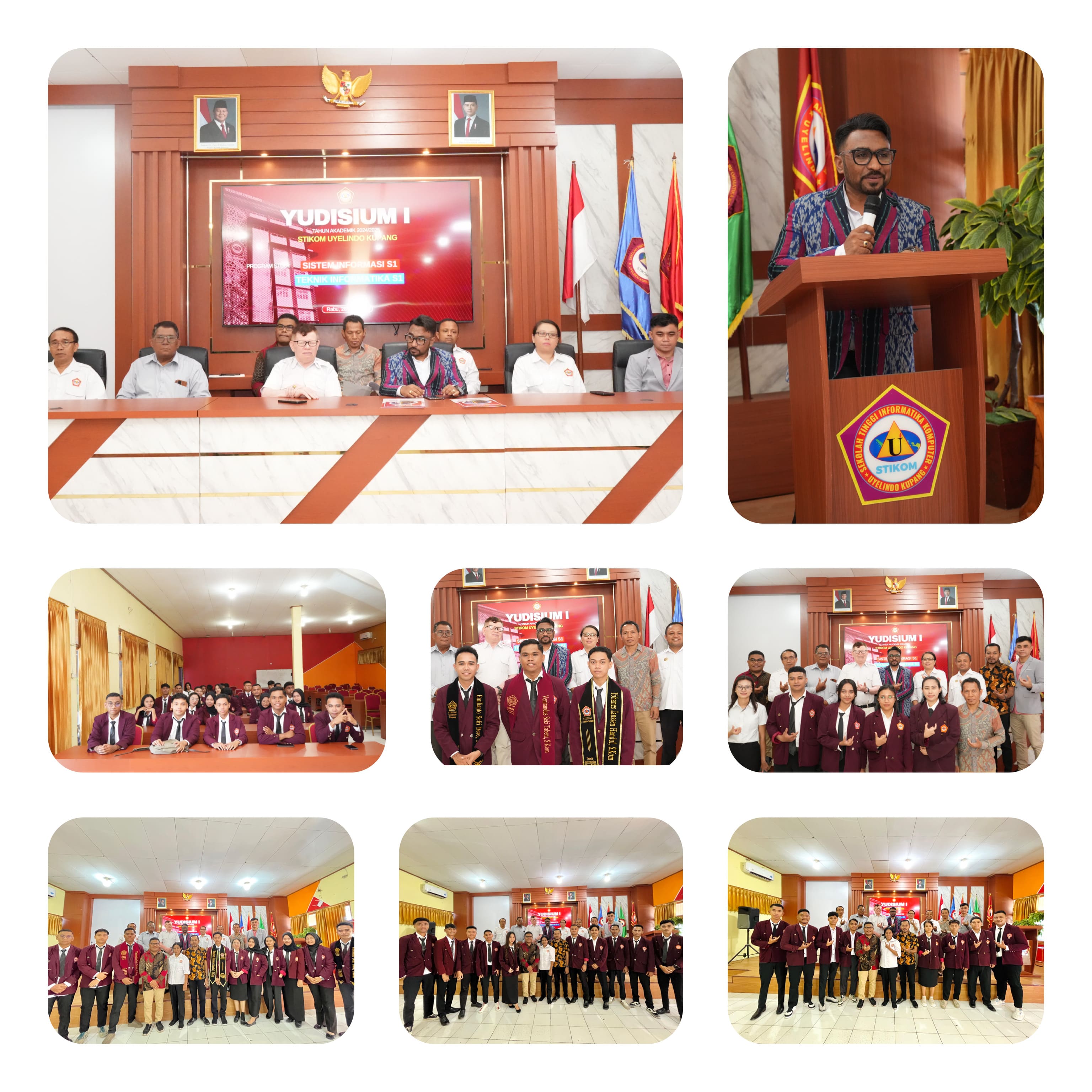 Pada Rabu, 28 Mei 2025, STIKOM Uyelindo Kupang menyelenggarakan Yudisium I Tahun Akademik 2024/2025. Acara ini diadakan di Aula STIKOM Uyelindo Kupang, diikuti oleh 32 mahasiswa yang telah berhasil menyelesaikan tugas akhir dan memenuhi persyaratan yudisium. Para peserta yudisium ini terdiri dari 4 orang mahasiswa dari program studi Sistem Informasi Strata Satu (S-1) dan 28 mahasiswa program studi Teknik Informatika Strata Satu (S-1). Selain para mahasiswa, hadir pula pimpinan Yayasan Uyelewun Indonesia, Ketua STIKOM Uyelindo Kupang bersama jajaran pimpinan.