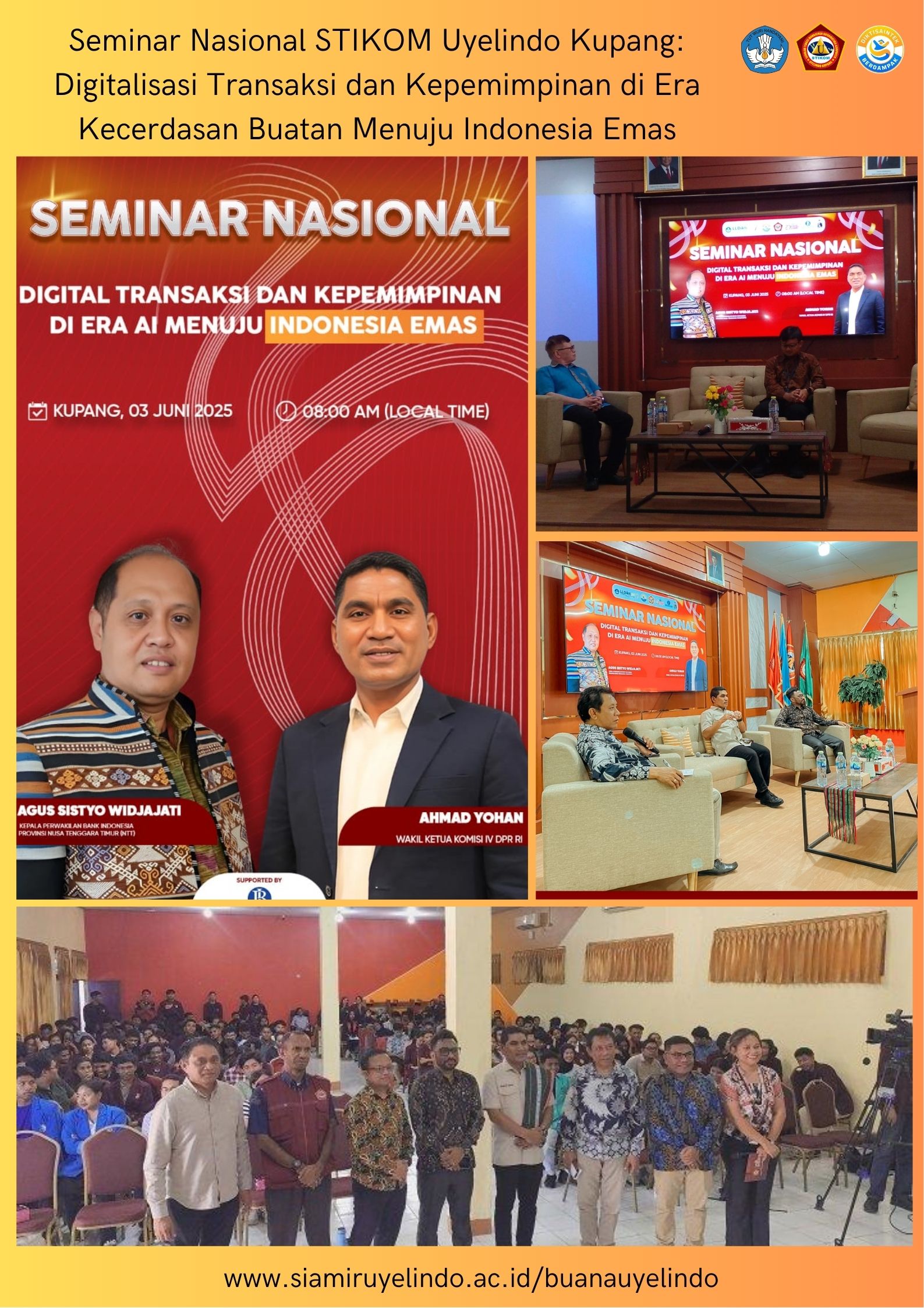 Buanauyelindo - Pada hari Selasa, 3 Juni 2025, Sekolah Tinggi Manajemen Informatika Komputer (STIKOM) Uyelindo Kupang menyelenggarakan seminar nasional dengan tema "Digitalisasi Transaksi dan Kepemimpinan di Era Artificial Intelligence Menuju Indonesia Emas." Kegiatan ini menghadirkan dua narasumber utama, yakni Bapak Didit, selaku Kepala Deputi Bank Indonesia Cabang Kupang, dan Bapak Ahmad Yohan, Wakil Ketua Komisi IV Dewan Perwakilan Rakyat Republik Indonesia (DPR RI).